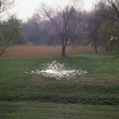 a few hundred tiny taped to a net hung in the Beemsterpolder near the fortress of Spijkerboor. The net was stretched on the former water level of the Beemster lake. The reflexion of the sun and sky of the mirrors visualise this past.